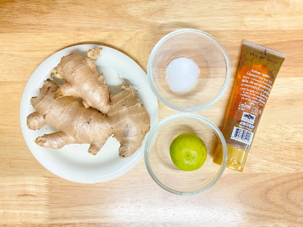 1 ส่วนผสมที่เราจะใช้มี ขิง มะนาว และน้ำผึ้ง เริ่มจากทำความสะอาดขิงกับมะนาวให้ดีก่อน